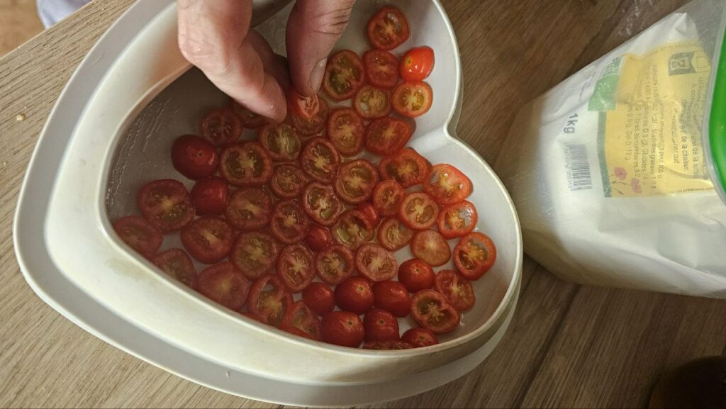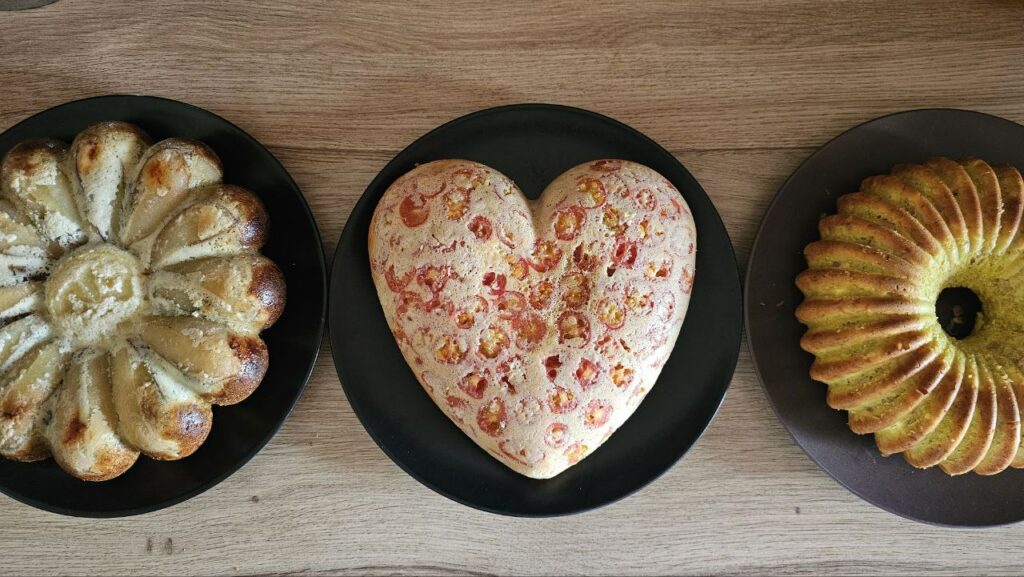 Les quiches ci-après dans des moules en silicone (mon mec en possède toute une collection) : poire et bleu d’Auvergne, tomates cerises chèvre et olives, lardons fromage et crème fraîche.