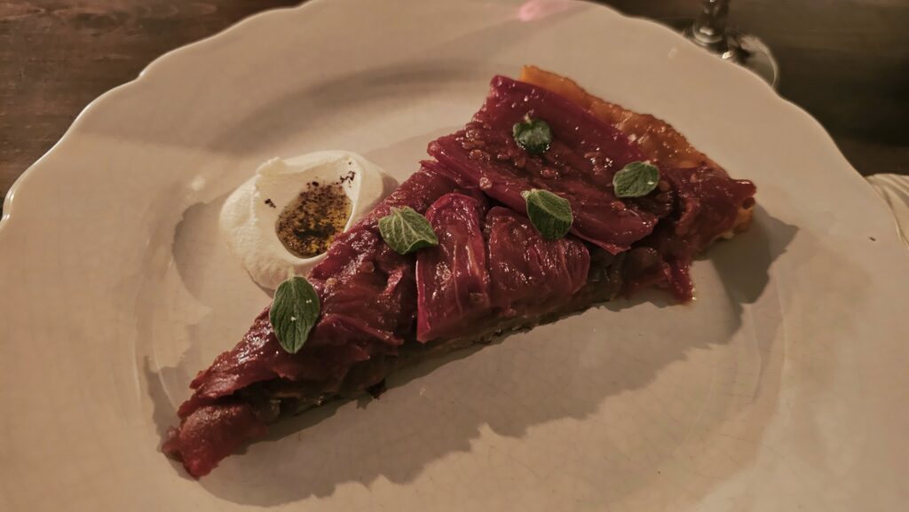 Une tarte tatin confiture d’oignons tomates et origan, une merveille ! Une salade décorée de perles de vinaigre. Ma moitié prend des notes mentales pour reproduire les mets à la maison. Vient ensuite un délicieux risotto à la milanaise, safran et beurre noisette que j’accompagne d’un deuxième verre d’un vin sicilien. Une panacotta, confiture de kaki, sirop de cerise et amaretto, une fleur de safran. On se régale. On reconnaît un vrai savoir-faire et surtout le plaisir de recevoir chez soi, un plaisir sincère qui sublime des plats simples en apparence. Formidabile !