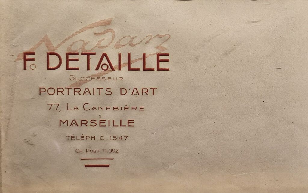 Fernard Detaille successeur de Nadar au 77 de la Canebière. Le studio se tenait en lieu et place des Nouvelles Galeries, grand magasin disparu en 1938 suite à un tragique incendie qui a causé la mort de 73 personnes. S’y trouve aujourd’hui une franchise du temple de la junk food américaine.