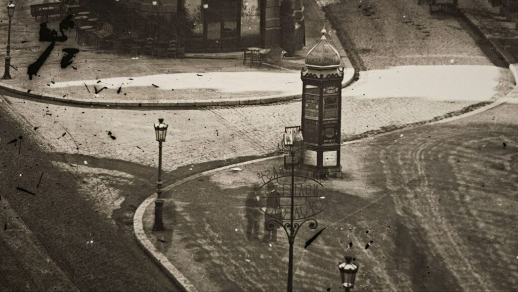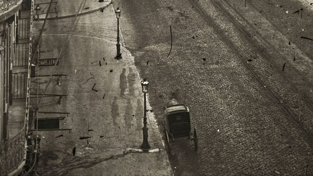 Avec cette photographie (plaque de verre) d’Adolphe Terris (vers 1865), on trouve une des plus anciennes représentations de la Canebière (voie aménagée entre 1857 et 1863). Les Nouvelles Galeries ne se dresseront au premier plan à droite que 30 ans plus tard (1894). Je me suis souvent perdu dans les détails, ci-dessous quelques silhouettes qu’on distingue à peine sur la photo ci-dessus si l’on ne s’y penche pas.