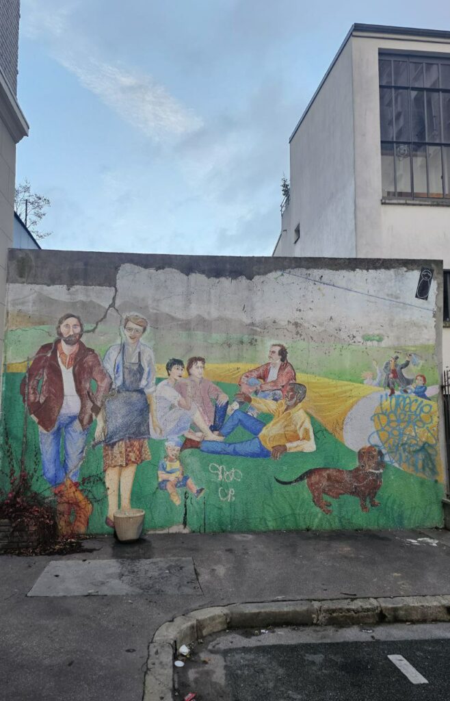des humains peints et un chien saucisse, villa Stendhal, 20e