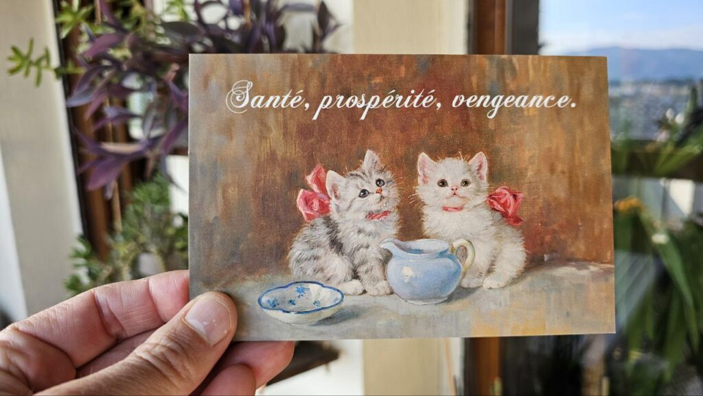 GCUM(2) à proximité du bar, j’écris mes dernières cartes de vœux puis scelle l’enveloppe avec la langue humide d’une pression, une fada blanche. Ladite carte achetée à la boutique du Tampographe Sardon à Paris 👇