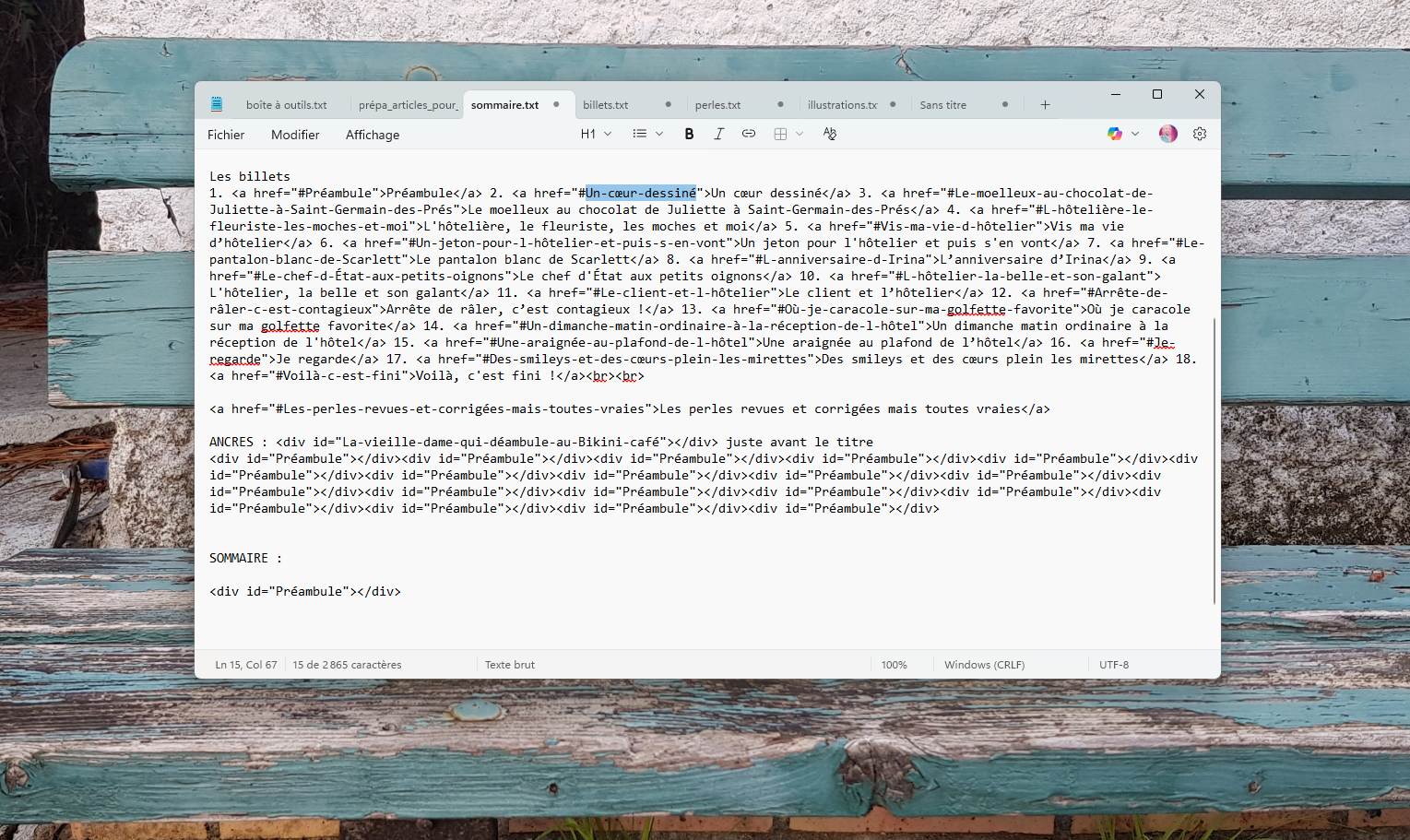Hop ! deux captures pour le prix d’une. Les rouages d’une nouvelle page(1) parue vendredi. Je ne suis pas un as en informatchique ni en codage mais, curieux de nature, je reproduis des usages qui fonctionnent : des balises HTML qui me permettent de poser des ancres. Comme l’environnement WordPress n’est pas des plus user-friendly, je copie-colle(2) le code utile dans un document bloc-notes (Word sans mises en forme) pour n’en garder que les balises utiles. Une chatte n’y retrouverait pas ses petits. Ou peut-ĂȘtre que si.