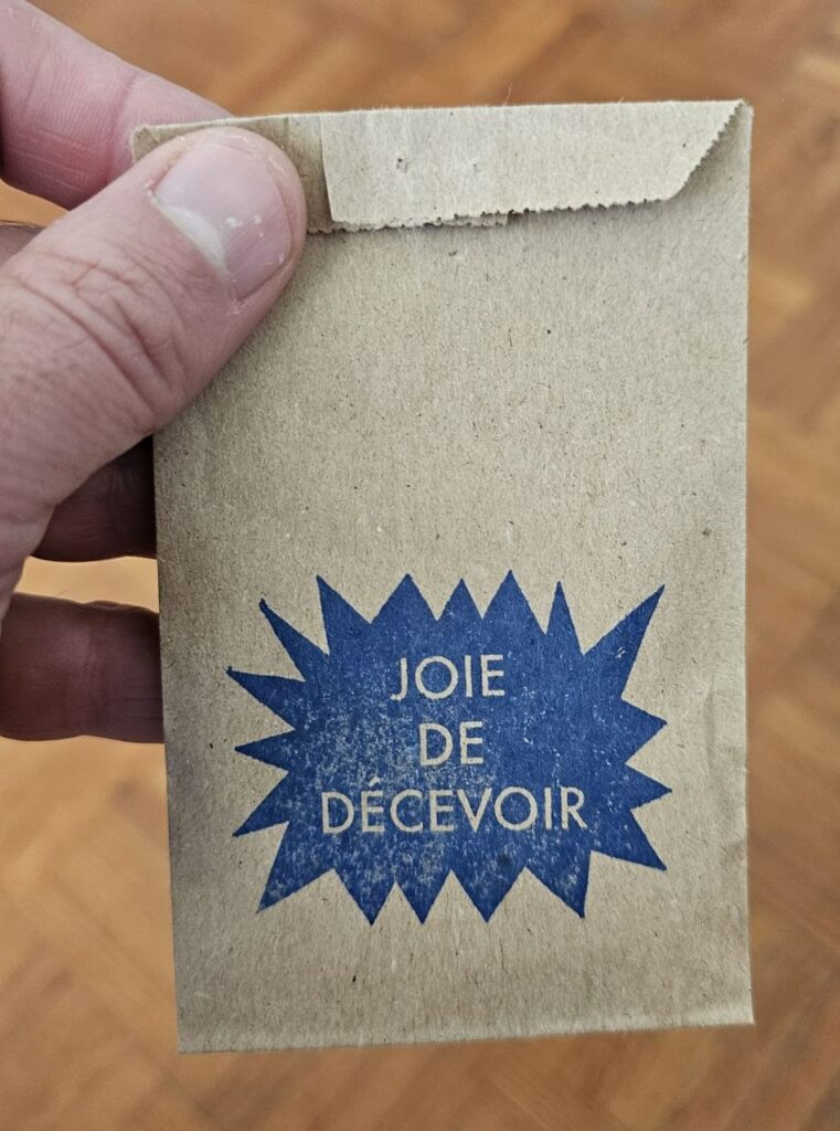 Ça n’est pas ça qui va réparer le monde mais un peu de douceur, de joie, de rire, ça ne fait de mal à personne. Le chien à son poste d’observation, la tête posée sur le barreau du garde-corps. Le rire quand j’ai lu le mail d’une utilisatrice qui indique : mon ordinateur a craché. Ou quand j’ai vu Brad Pitt sur Vinted (billet). Le selfie avec l’amie Laurie devant un collage de Un cœur de plus qui affiche le message : la vie est belle, à 1:35 du matin. La parodie(1) sur un tampon de l’habituel message plaisir d’offrir, joie de recevoir 👇