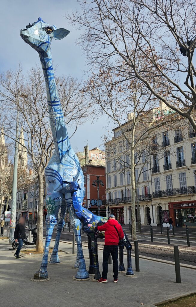 Figures connues des Marseillais, la girafe Zarafa et son girafon Marcel (utilisé comme borne de dépôt et d’échanges de livres) trônent fièrent en haut de la Canebière, face à l’Artplexe (complexe cinéma, bar, resto). L’œuvre des plasticiens du collectif ABC (Art Book Collectif) fait référence à la girafe offerte à Charles X par Méhémet Ali. Zarafa est la première girafe à être entrée en France, où elle a vécu pendant dix-huit ans, de 1827 à 1845, dans la ménagerie du Jardin des Plantes à Paris. (Source : Wikipedia)