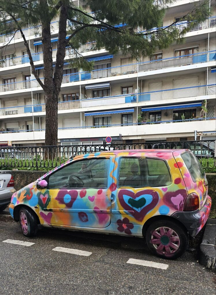 Pour le défi 52/2026 orchestré par Anne, la photo du dimanche autour d’un mot : couleurs. Allez, j’enfonce une porte ouverte : les couleurs n’ont que plus de force que lorsqu’elles sont en contraste. Exemple avec une fresque(1) de Kashink vue par une journée pluvieuse, à l’arrêt de bus qui jouxte la Flèche d’Or dans le 20e. J’étais à Paris et je n’avais oublié ni mon parapluie ni ma curiosité.