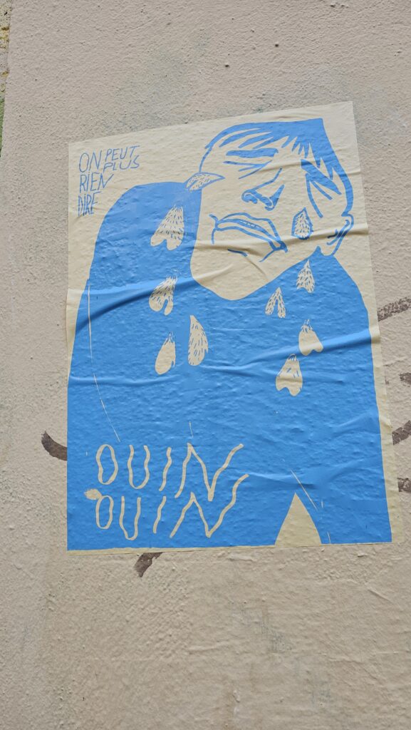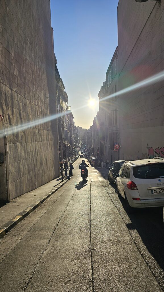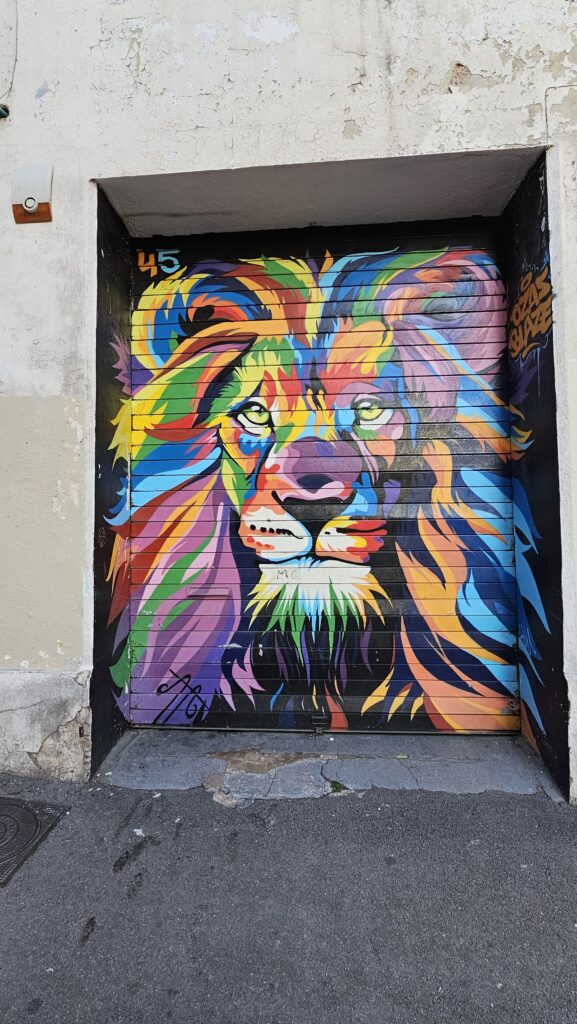 Sur le chemin, je capture deux ou trois clichés avec mon téléphone : le soleil qui habille les flèches de l’église des Réformés en haut de la Canebière, qui m’éblouit lorsque je descend la rue Balthazar-Dieudé (Marseille, c’est un peu San Francisco, ça grimpe pas mal dans certains quartier), une affiche collée sur le parcours de la Journée internationale des droits des femmes (le personnage chouine et pleure des testicules) puis un magnifique lion multicolore de l’artiste-graffeur Ozas.