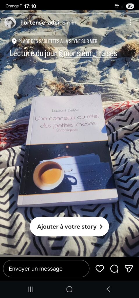 Et dans la chronologie de ma journée, des SMS et messages amis qui me disent avoir lu et aimé l’objet qui occupe mes pensées (mon mec n’en peut plus). Laure m’envoie une photo de mon livre qui se prélasse sur la plage des Sablettes.