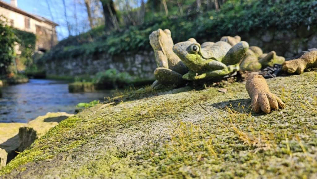Au bord de la mare, de fausses grenouilles, stoïques (forcément), deux petites mains de pierre ont perdu leur propriétaire. Et je m’émerveille devant les ploc ploc ploc des batraciens 👇