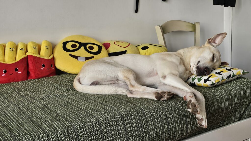 Le petit a l’habitude d’être paparazzé. Je le filmais récemment en flagrant délit de paresse (il a tellement raison de se la couler douce). Entre le moment où j’ai pris la photo et celui où j’écris ces lignes, il est allé s’écraser sur son coussin préféré (la preuve en photo ci-après). À ses côtés, je noircis les pages d’un cahier, je mets à jour ma toudouliste, les choses à ne pas oublier dans la valise que j’emporte en Charente.